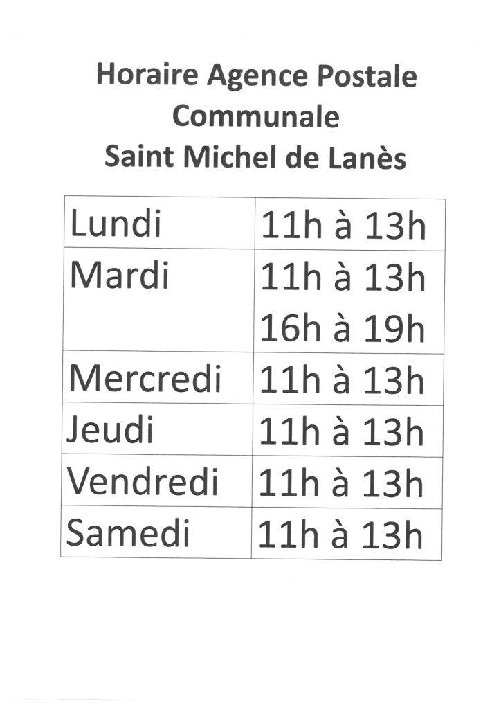 La poste Cliquez ci-dessous pour obtenir les horaires de l’Agence Postale : Adresse : Agence Postale Saint-Michel-de-Lanès 18 r Menuisiers, 11410 SAINT MICHEL DE LANES Tel : 04 68 23 99 15